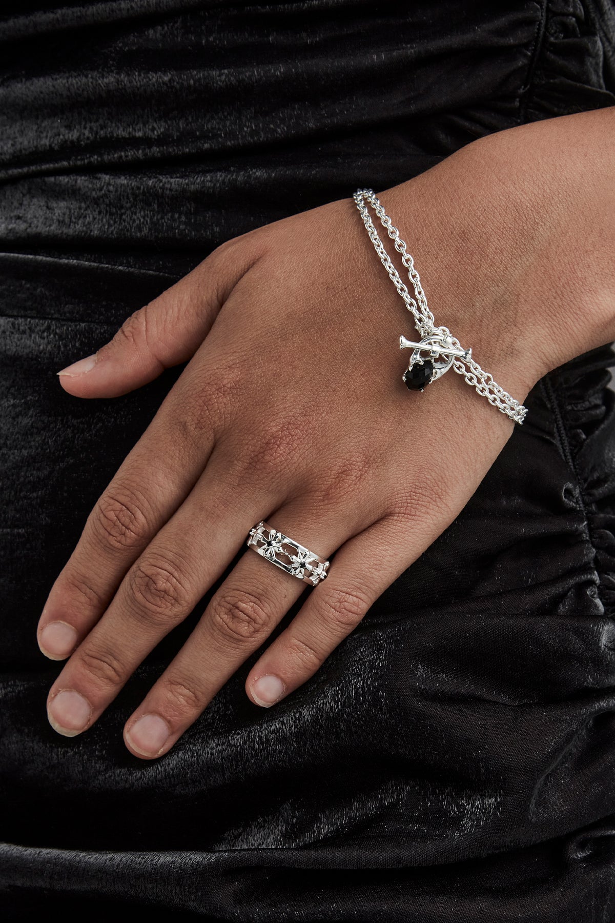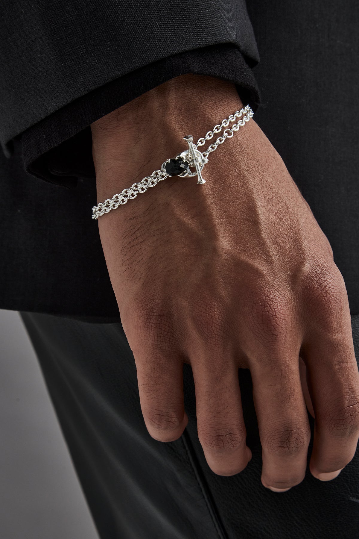 Elevate your style with the edgy elegance of the Stolen Girlfriends Club Broken Tears Bracelet. Crafted from premium sterling silver, this bracelet features a striking black onyx gemstone, expertly cut to capture and reflect light in a captivating manner. The centerpiece showcases a distinctive design with silver elements crossing over the onyx, creating a modern and bold aesthetic.
