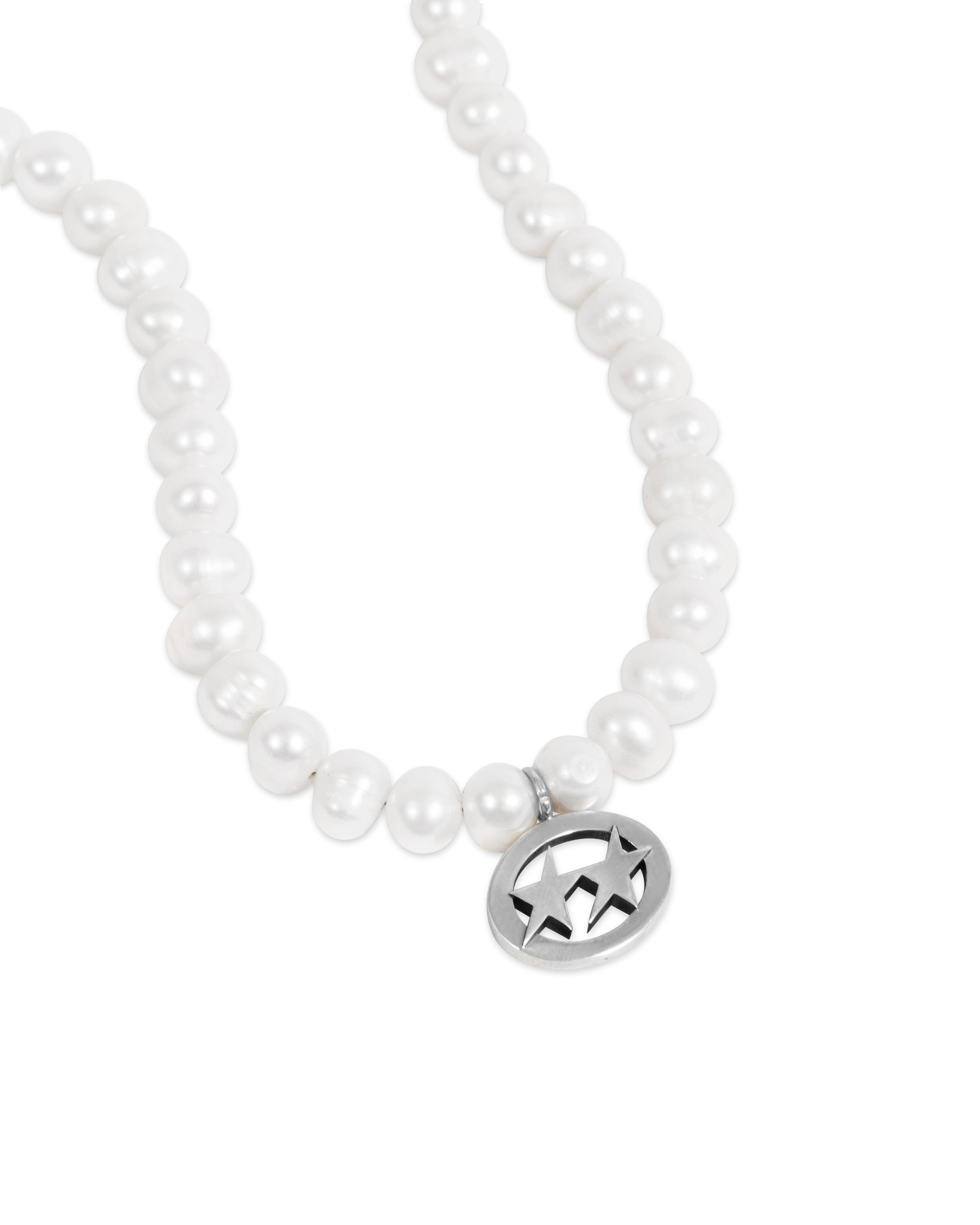 The TwoJeys Icon Pearl Necklace is a harmonious blend of classical grace and contemporary branding. This piece makes a statement with its luminous string of pearls, each carefully selected for its lustrous sheen and uniformity. The centerpiece of the necklace is the sterling silver pendant, showcasing TwoJeys' iconic star motif.