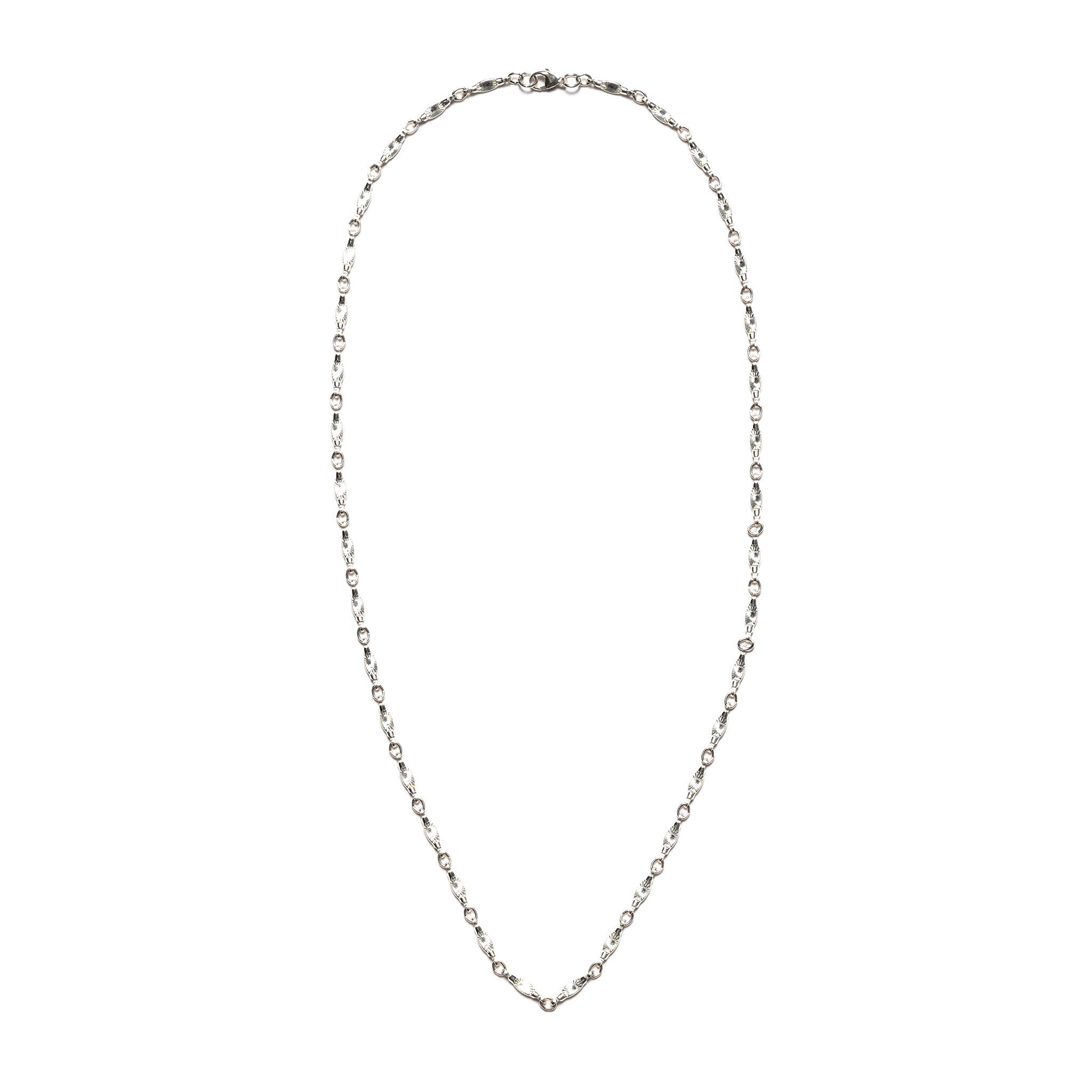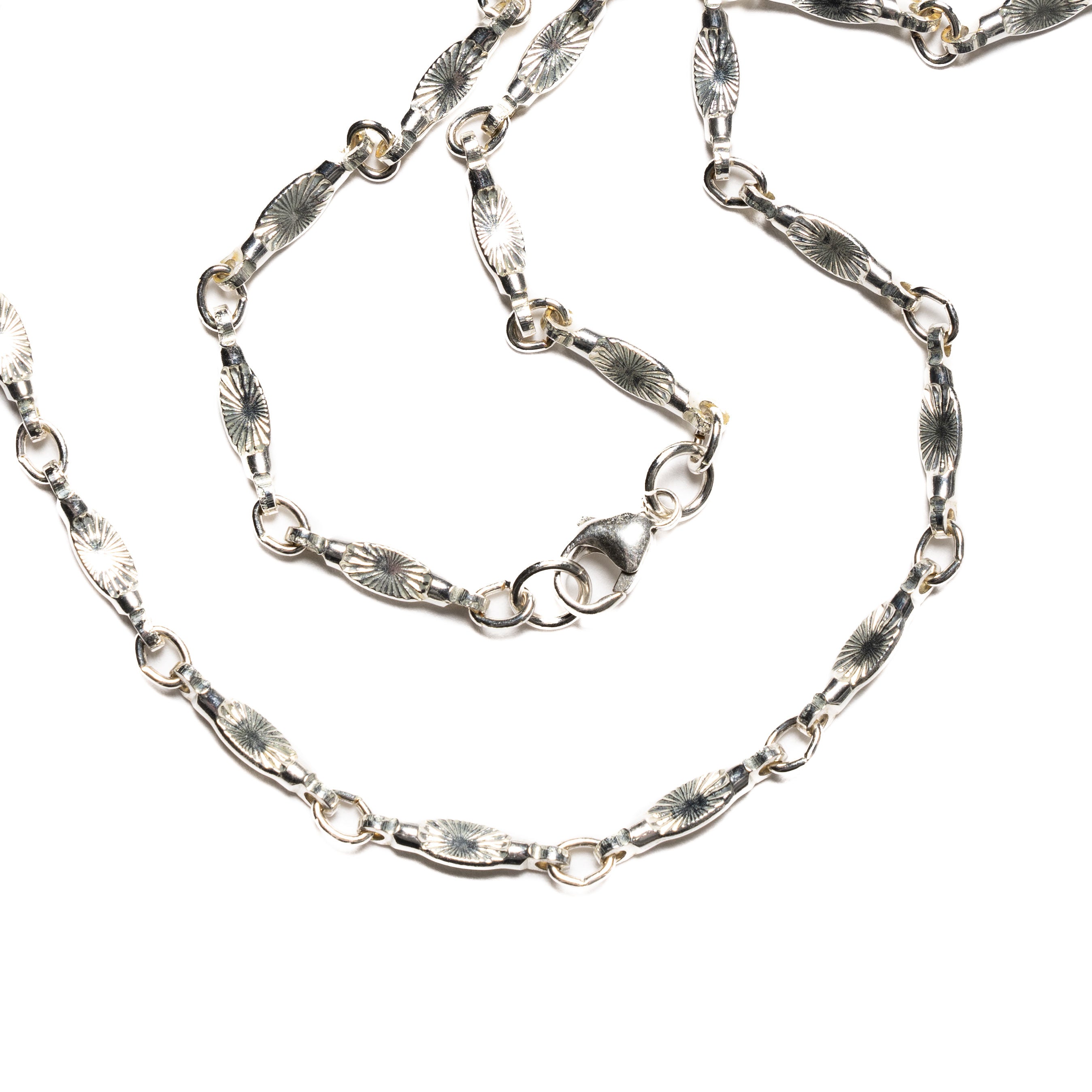 The Sunburst Chain by MAPLE is an exceptional accessory that features a series of intricately detailed links, each one bearing a sunburst pattern that catches the light and the eye with its reflective surface. The delicate etchings on each link create a harmonious pattern reminiscent of the sun's rays. The chain is versatile enough to be worn on its own, making a subtle yet impactful statement, or it can serve as a foundation for your favorite pendants, enhancing their appearance with its detailed backdrop.